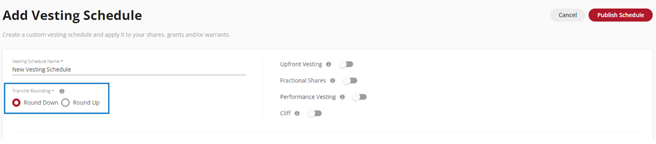 All newly added vesting schedules, following this release, will include the ‘Tranche Rounding’ setting which administrators can select prior to publishing. Vesting schedules using this setting can be applied to grant, transaction and warrant records.