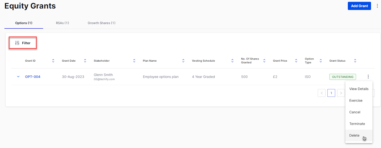 Once you have found the equity grant you wish to delete select the 3-dot menu and select 'Delete'. On the pop-up window, select 'Yes' to confirm the deletion.