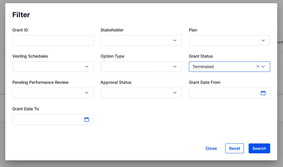 On the equity grant screen, the status of all grants that have been terminated will be updated to 'Terminated'. The vested shares on termination date will remain visible and the unvested shares that are forfeited will no longer appear in the dropdown vesting schedule.