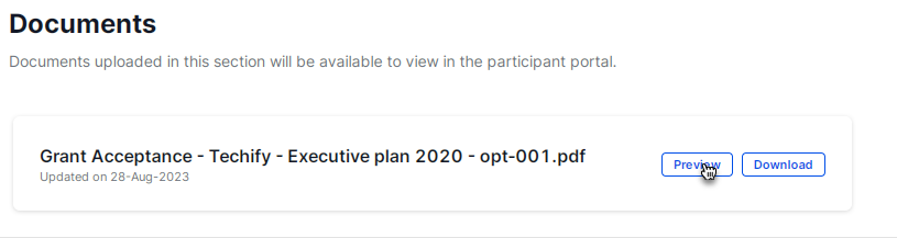 The grant agreement document can be viewed on the grant view details screen, within the Documents section card.