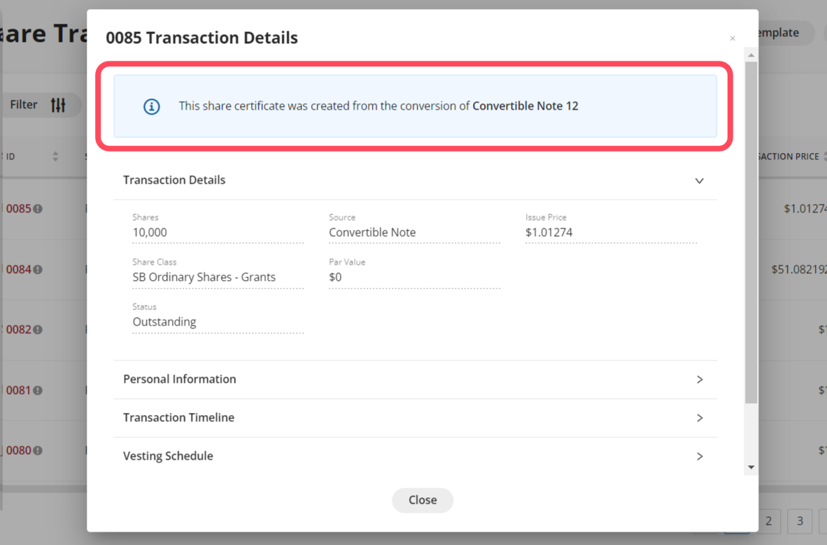 Company Administrators can now view the origin convertible instrument record information within the transaction details of a share issuance.