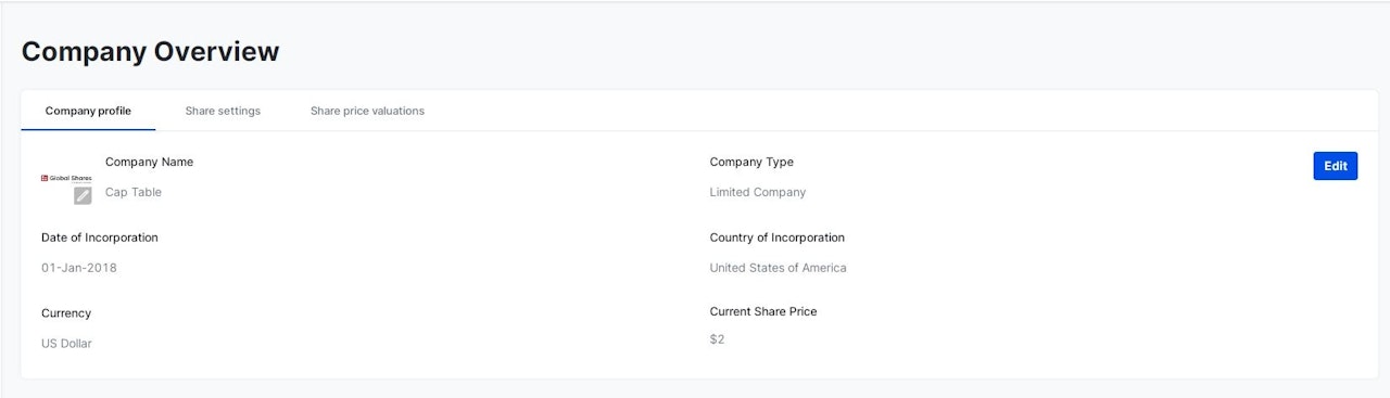 • Share price valuations - add, edit and delete different share valuation types for your company