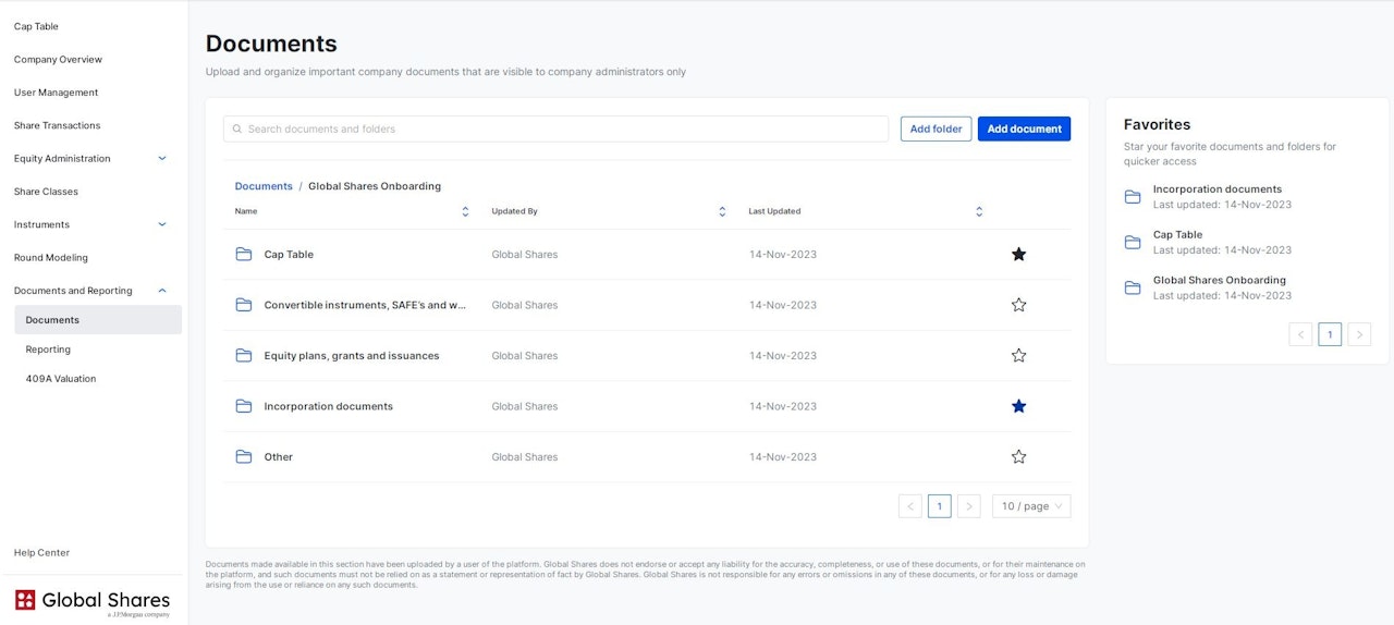 Within the Documents & Reporting > Documents section, company administrators have access to a centralized repository for uploading, organizing and overseeing the documents relevant to their company’s formation and share plans.