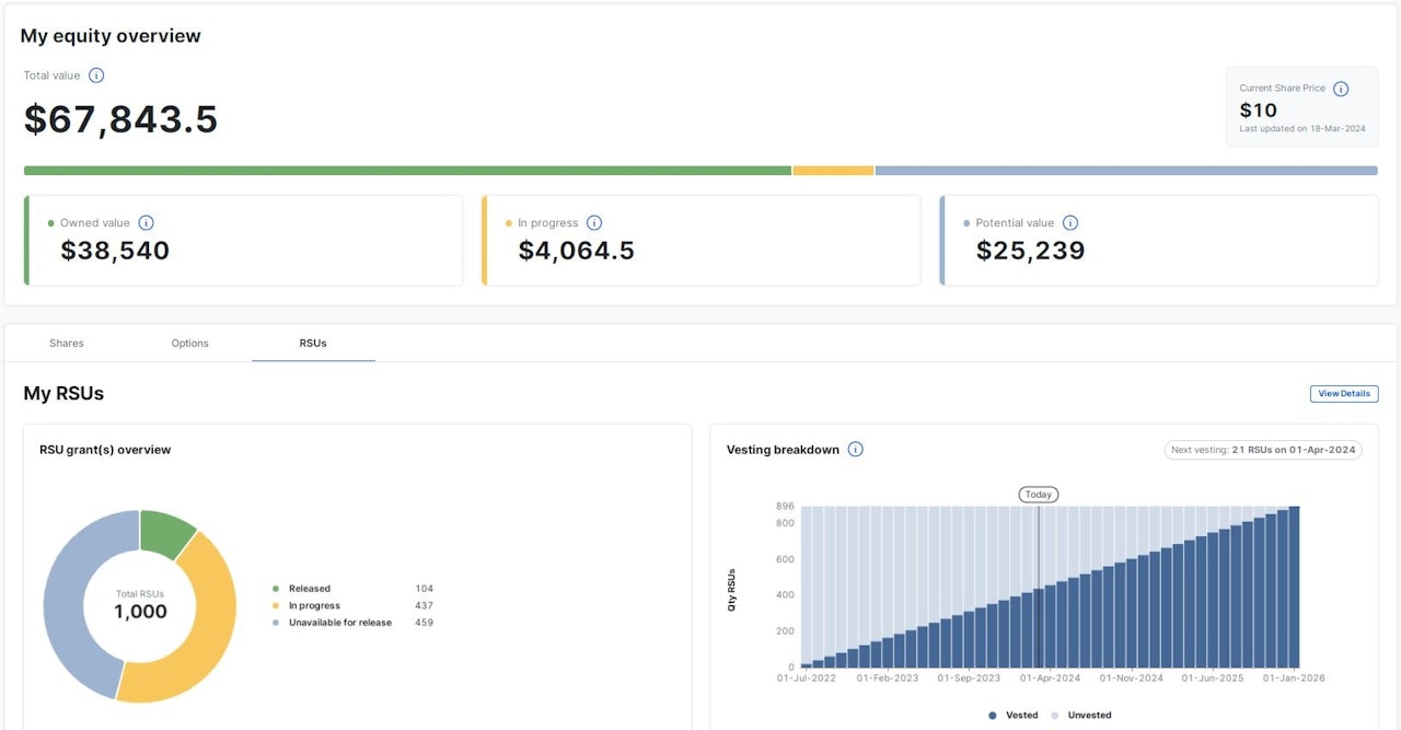 The RSUs dashboard provides an overview of the your RSU grants and will be displayed if you have an RSU grant regardless as to the status of that grant.